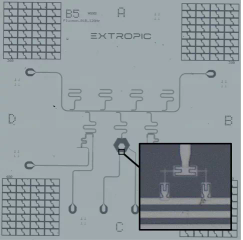 Figure 3: Microscope image of an Extropic chip. The inset shows two Josephson junctions, which are the devices that provide the processor with its critical nonlinearity.