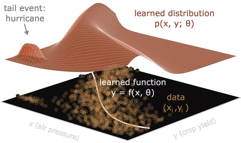 Figure 1: The principles of Extropic probabilistic AI accelerators. A simple example of low-complexity distributional learning failing to capture the effect of a tail event. Low air pressure almost always means rain and high crop yields. However, every so often, very low air pressure corresponds to a hurricane.