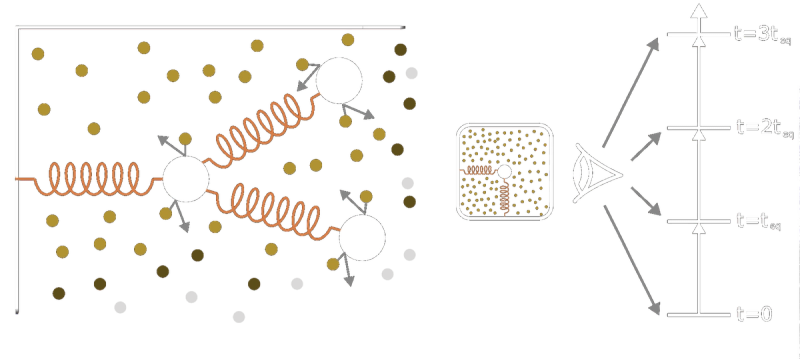 Figure 2: The operational principle of Extropic accelerators. (a) A simple mechanical analogy to Extropic accelerators. Since there are three masses in two dimensions, the steady state of this device would be a probability distribution over a 6-dimensional space. (b) Samples may be drawn from an Extropic accelerator by repeatedly observing the system, waiting at least the equilibration time teq between observations. teq is how long it takes for the noise in the system to destroy all correlations with the previous sample.